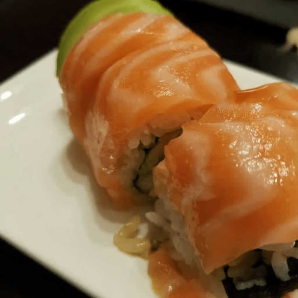 Fresh salmon, spicy sauce, and avocado rolled in seaweed with rice