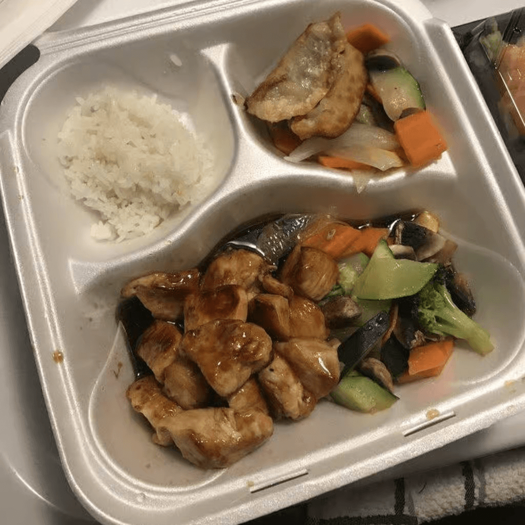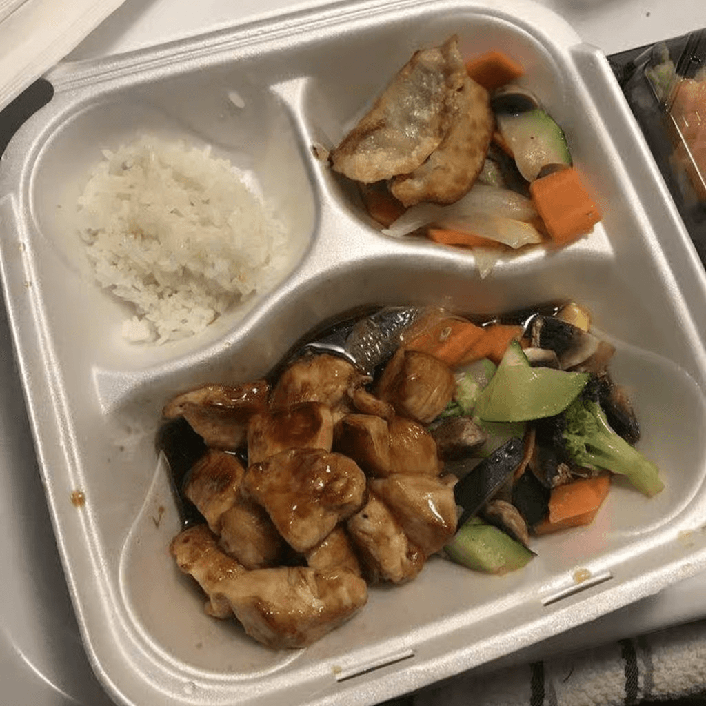 With pork gyoza, sautéed vegetables & steamed rice