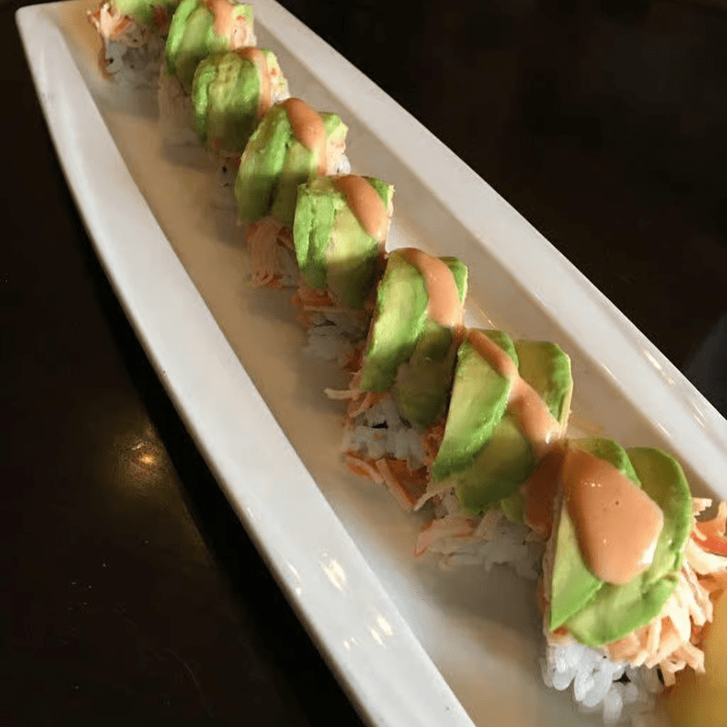 Fresh yellowtail, spicy sauce, and avocado rolled in seaweed with rice