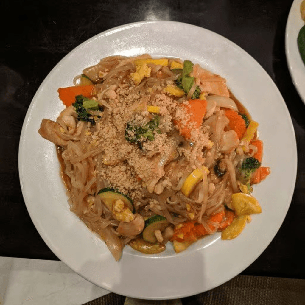 Rice noodles with veggies, bean sprouts, egg & peanuts