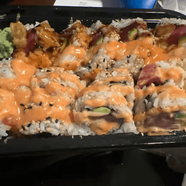 Cream cheese, tempura shrimp, crab topped with BBQ eel, fresh sliced tuna, spicy creamy sauce, and eel sauce
