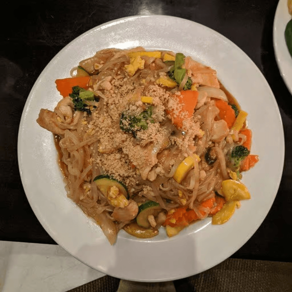 Rice noodles with veggies, bean sprouts, egg & peanuts. Served with choice of miso soup or side salad