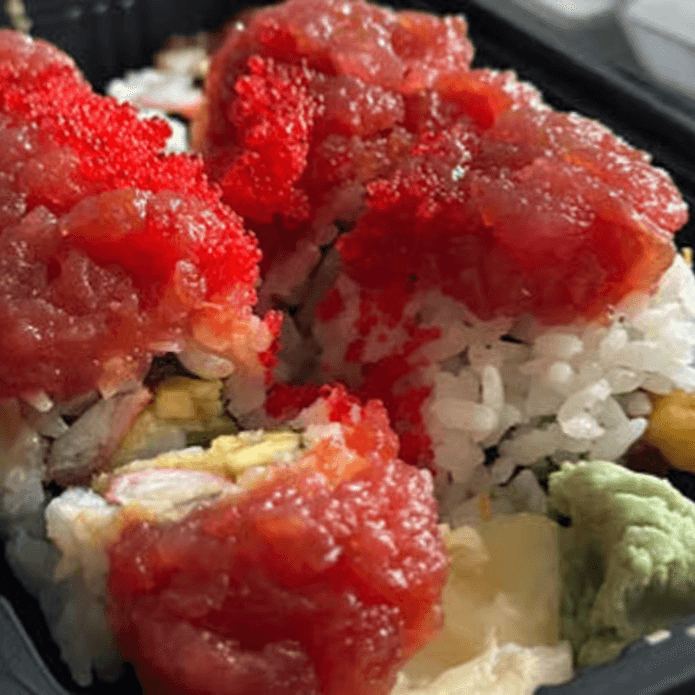 Shrimp tempura, crab, and avocado with spicy aioli, topped with sweet and spicy minced tuna and black tobiko
