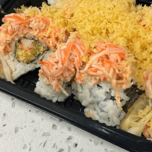 Crab, cucumber, avocado, Japanese mayo, eel sauce, and crunchy fried onion on top